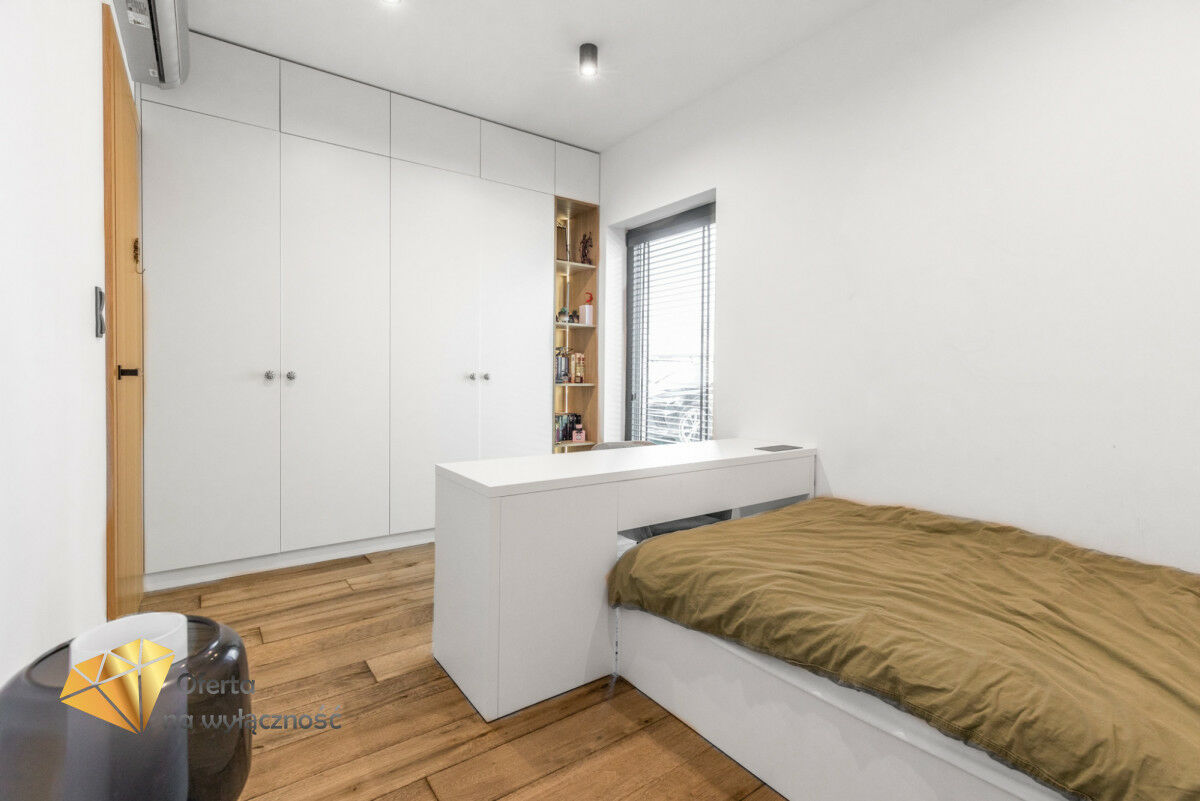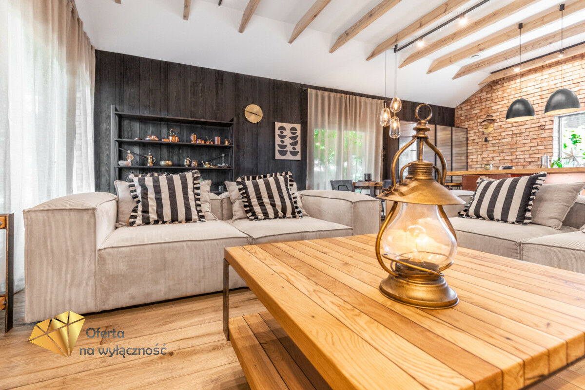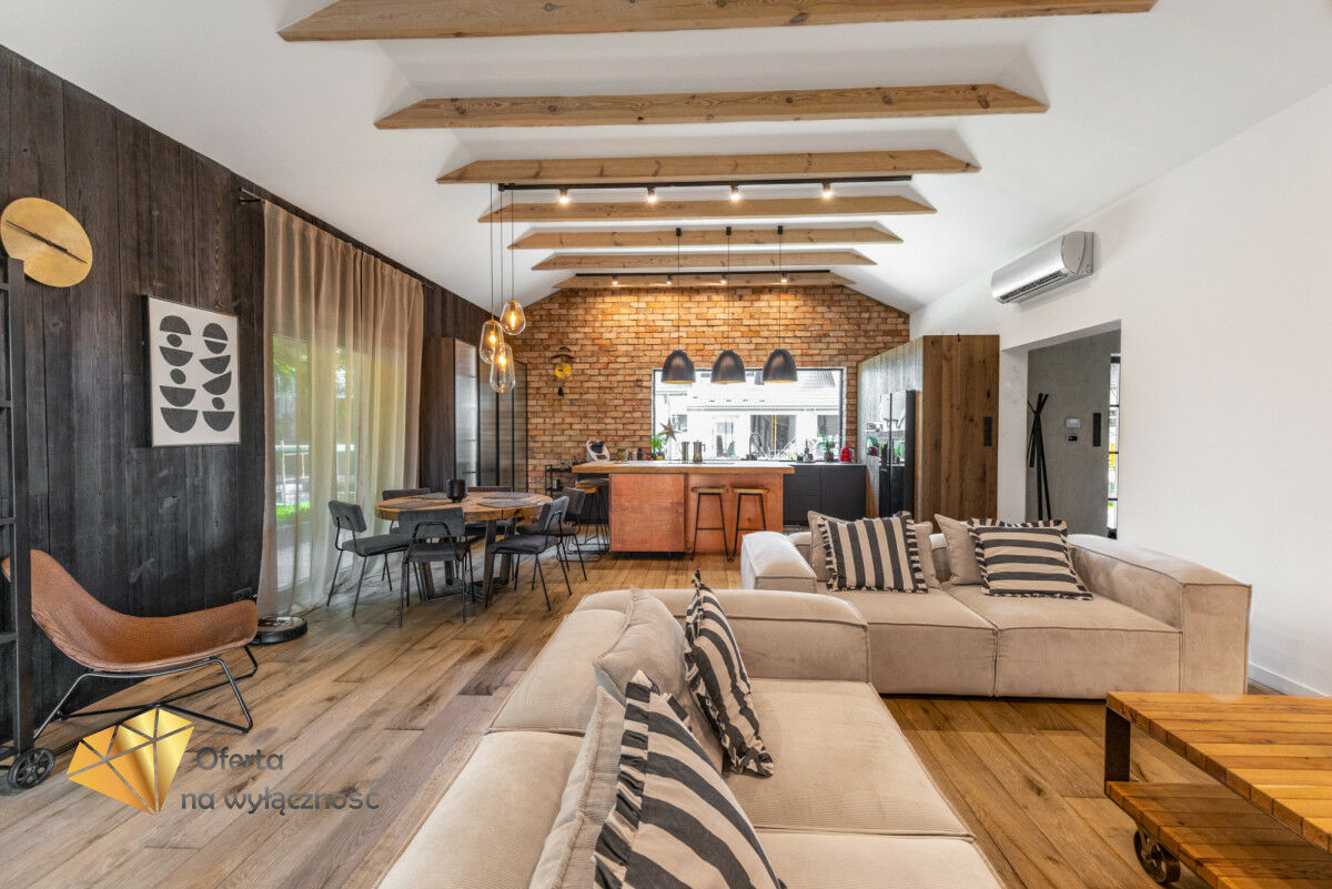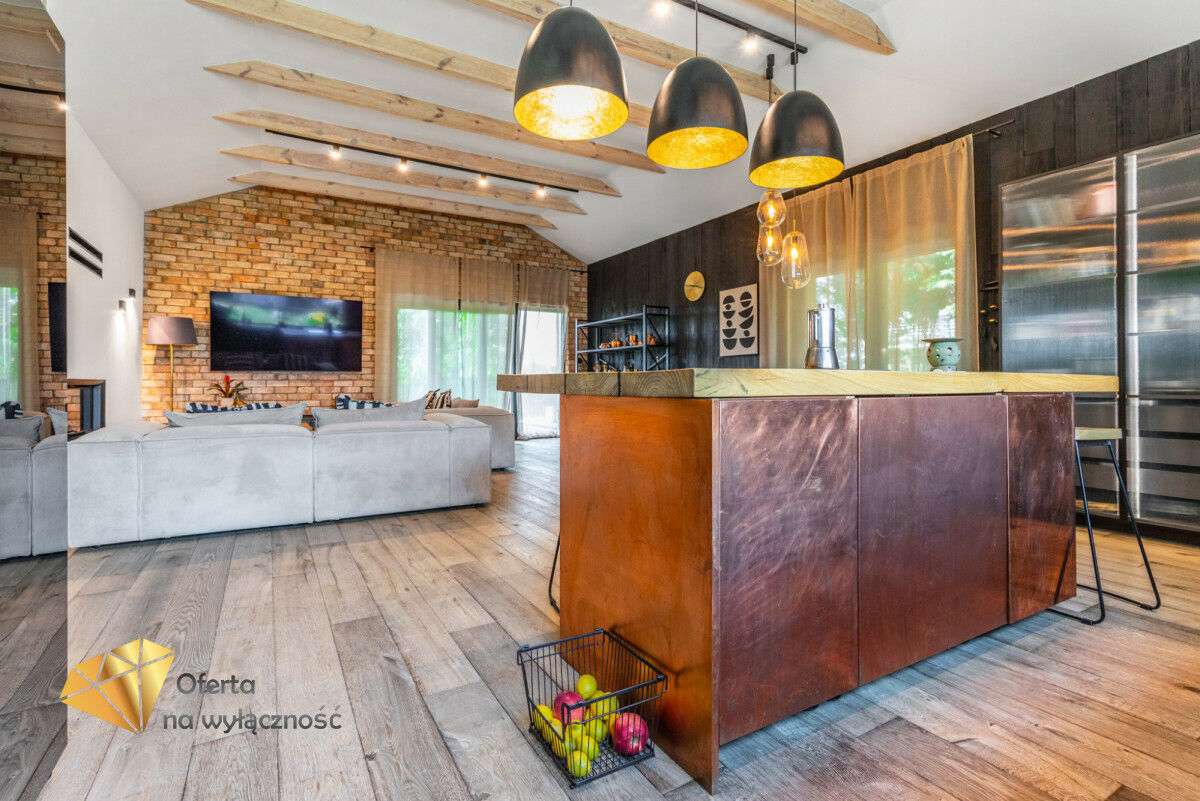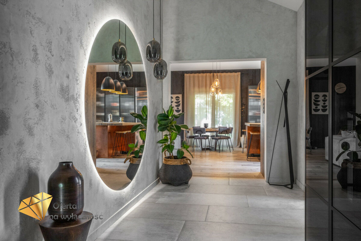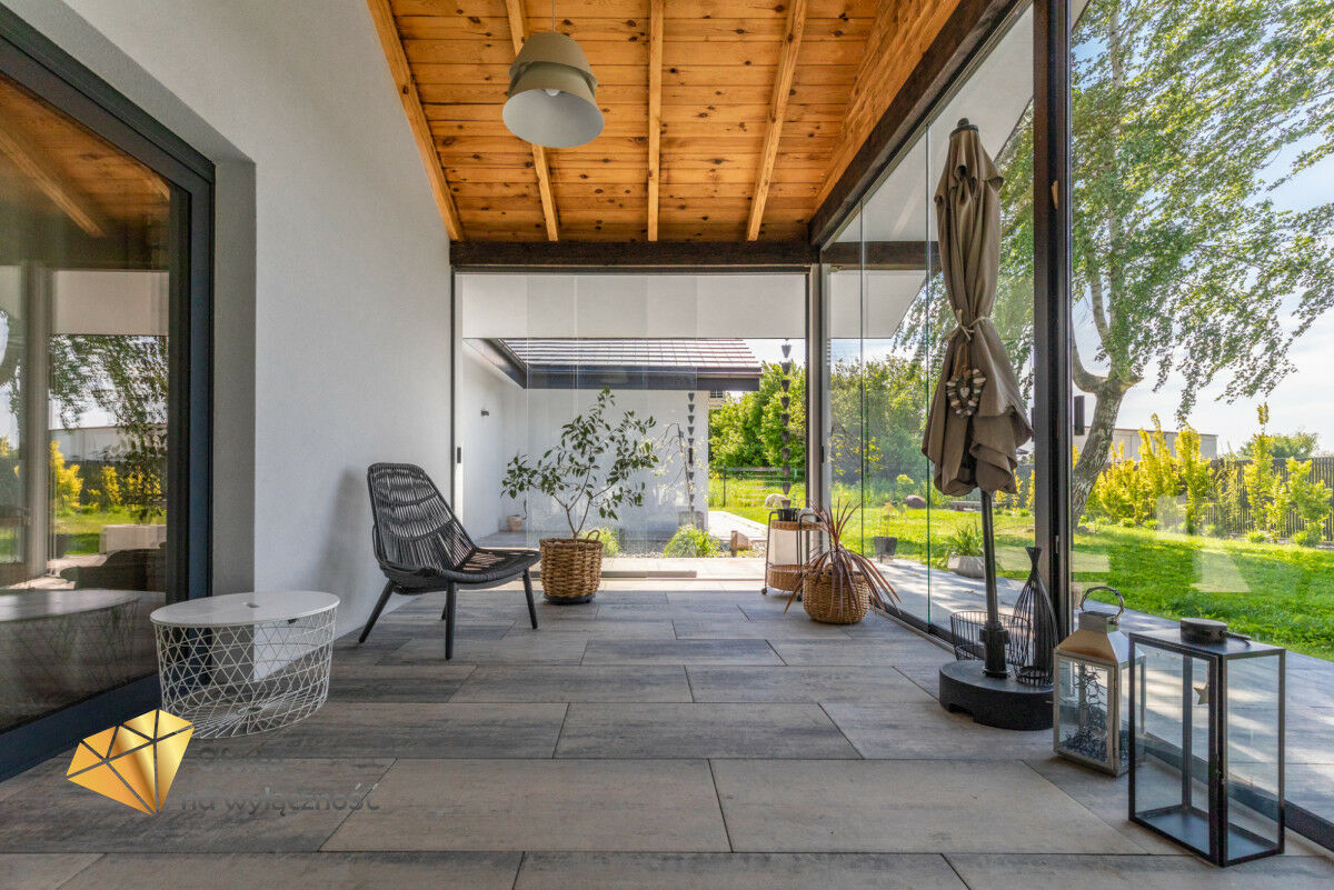 Wnętrze domu charakteryzuje się imponującą wysokością pomieszczeń (3,60 m), dużą ilością naturalnego światła oraz przemyślaną aranżacją. Z każdego pokoju można bezpośrednio wyjść do ogrodu, a całoroczny ogród zimowy stanowi wyjątkową przestrzeń do relaksu. Budynek został oddany do użytkowania w 2025 roku i wykonany z wysokiej jakości materiałów, takich jak dębowa podłoga firmy Chapel. Na terenie posesji znajduje się również garaż z zapleczem spiżarnym.